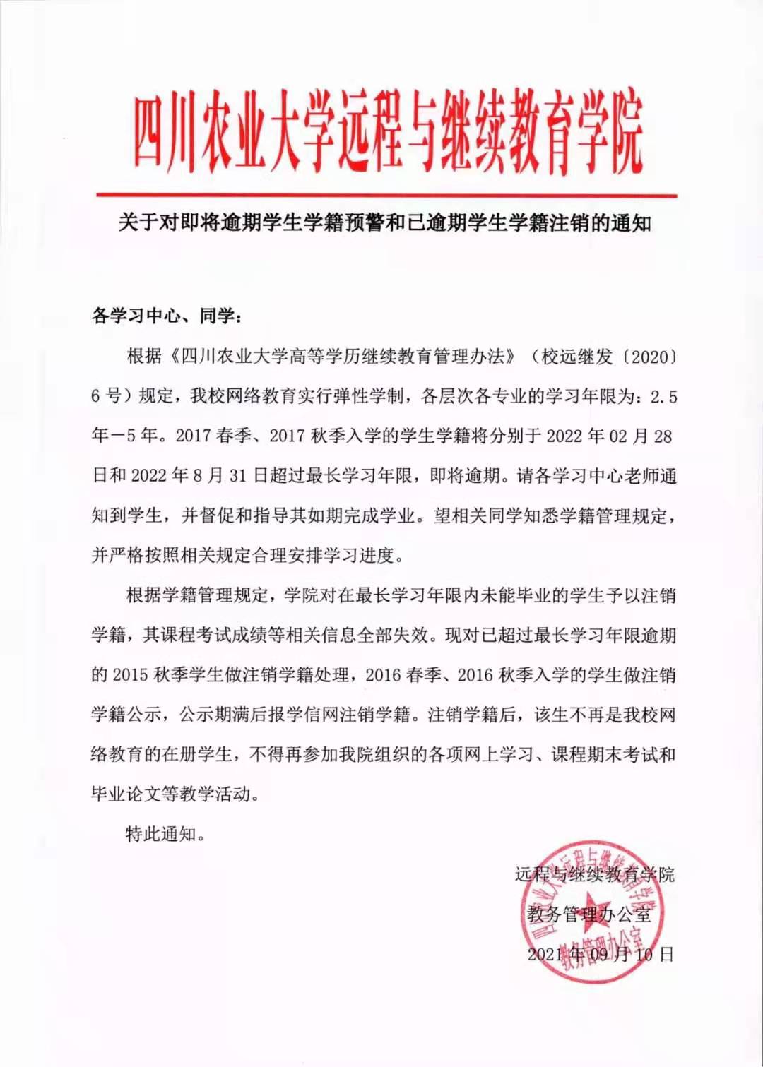 四川农业大学继续教育学院关于对即将逾期学生学籍预警和已逾期学生学籍注销的通知