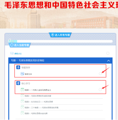 注意:类似于毛泽东、习近平、思想道德修养、中国近代史、马克思这类的课程进去都需要按照流程挂视频,挂完每一个专题的视频,后面会打钩,代表视频完成,才能做每个专题最后的专题测验。