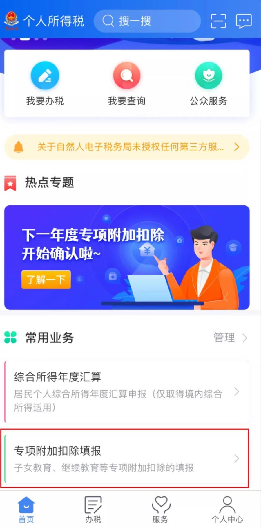 1、打开“个人所得税”APP,注册并登录,选择“首页”—“专项附加扣除填报”;