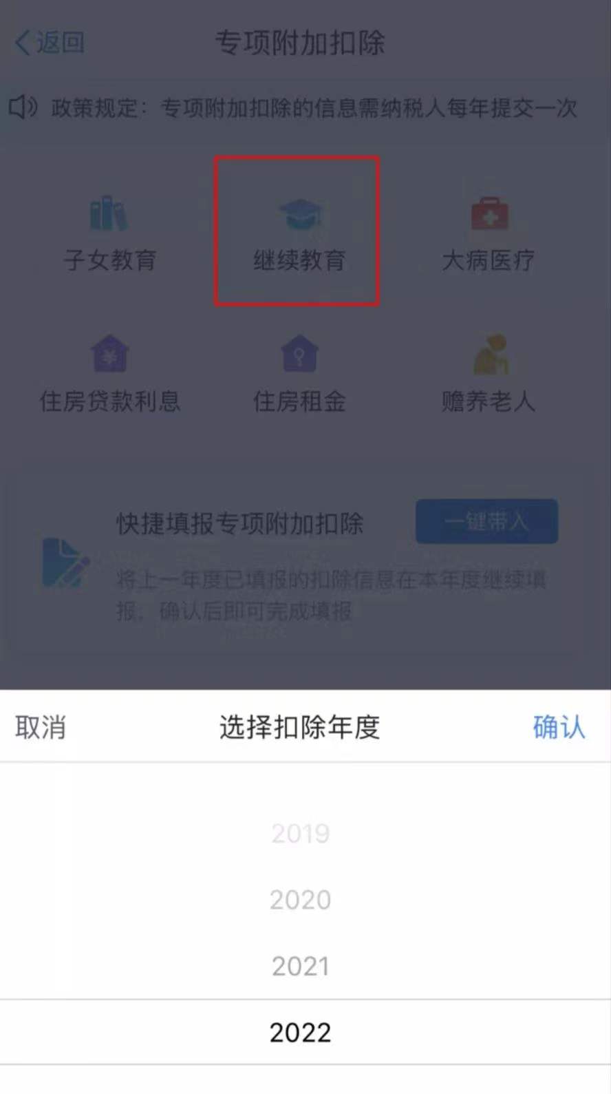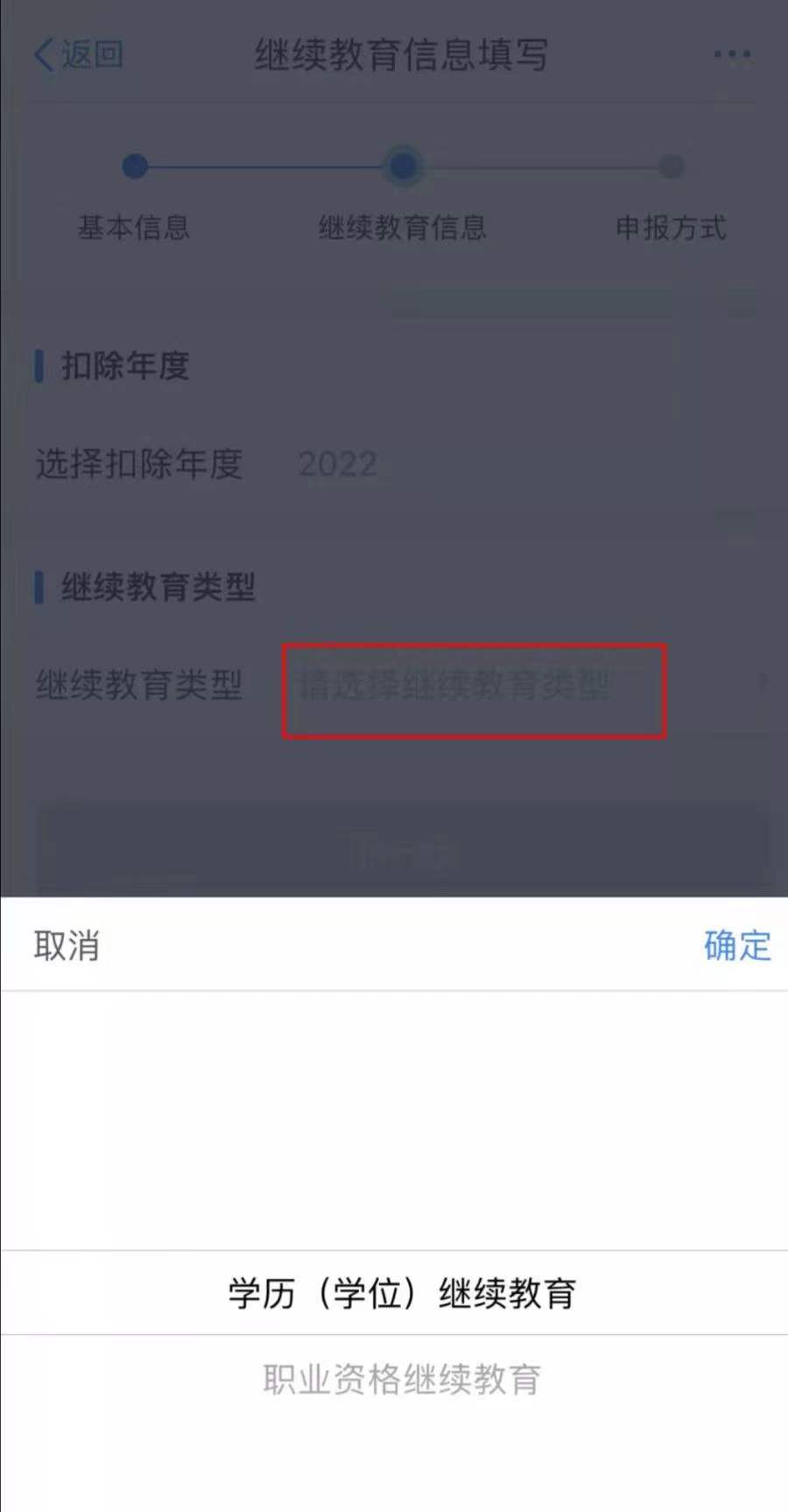 2、选择“继续教育”之后,选择相应的扣除年度点击“确认”;