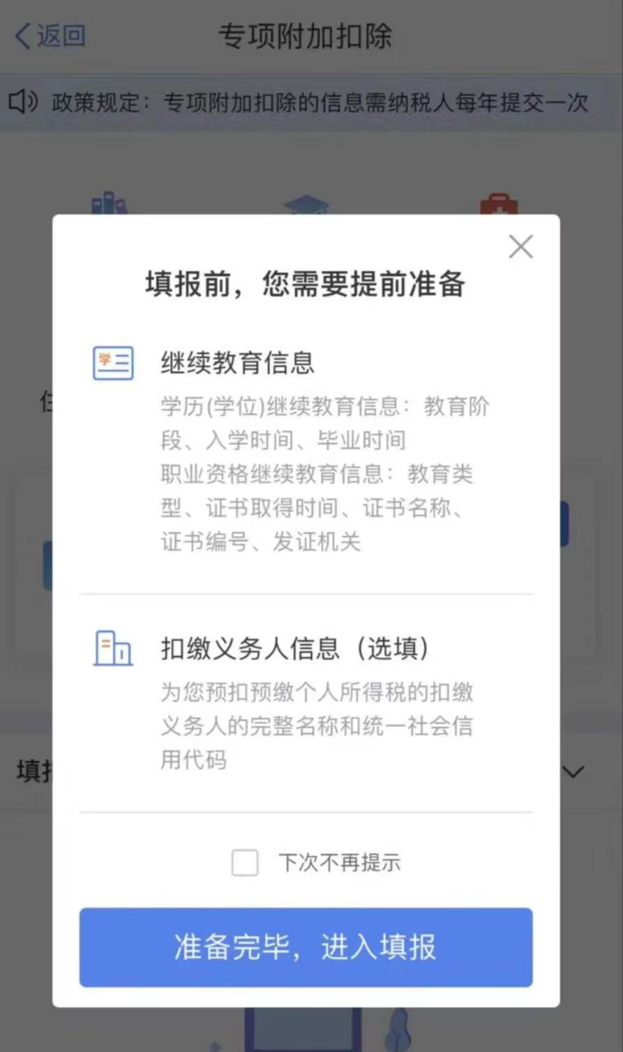 3、确认材料完备后,点击“准备完毕,进入填报”;