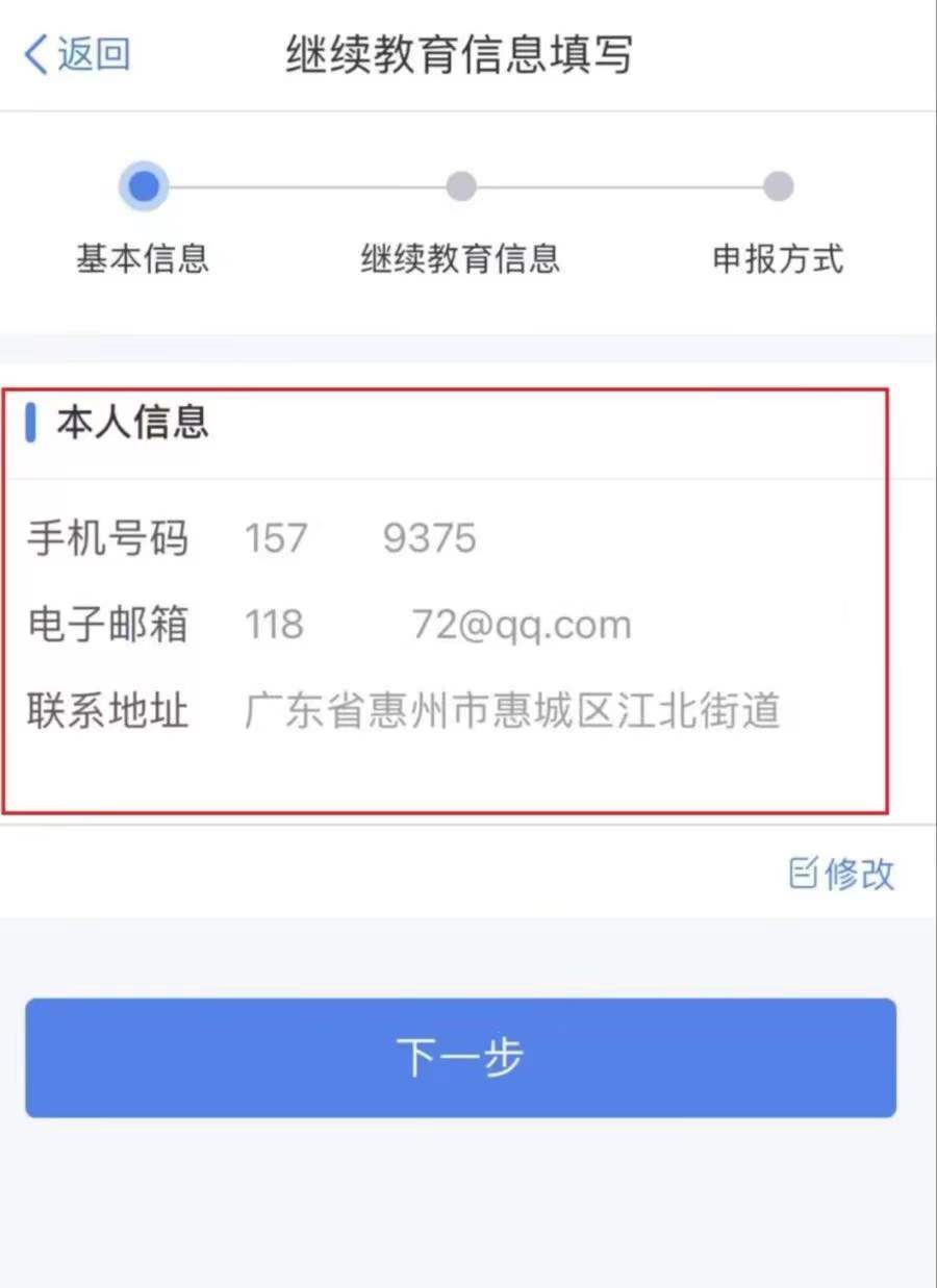 4、“电子信箱”和“联系地址”为选填,可直接点击“下一步”,阅读提示内容后点击“我知道了”;