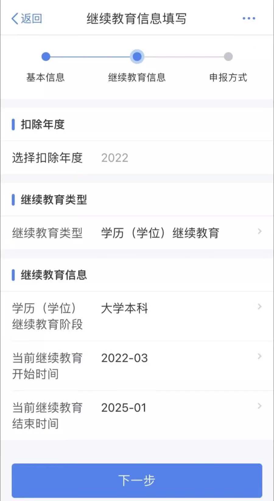 5、选择“继续教育类型”,填写相关信息后,点击“下一步”;