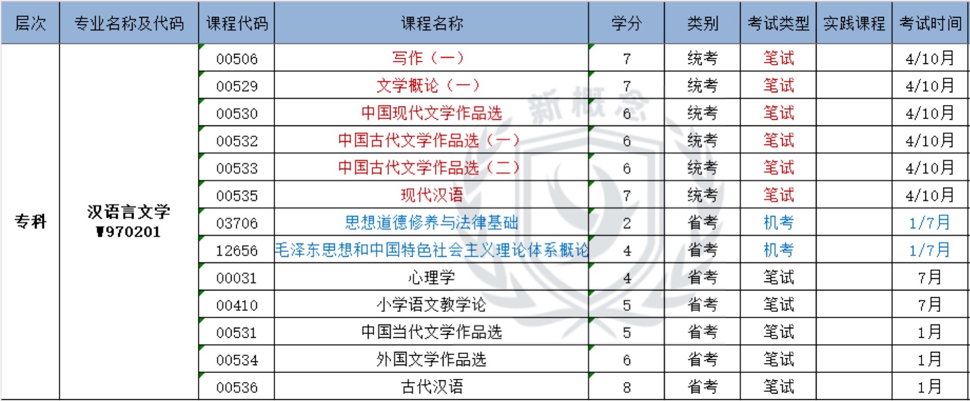 汉语言文学——自考专科科目表