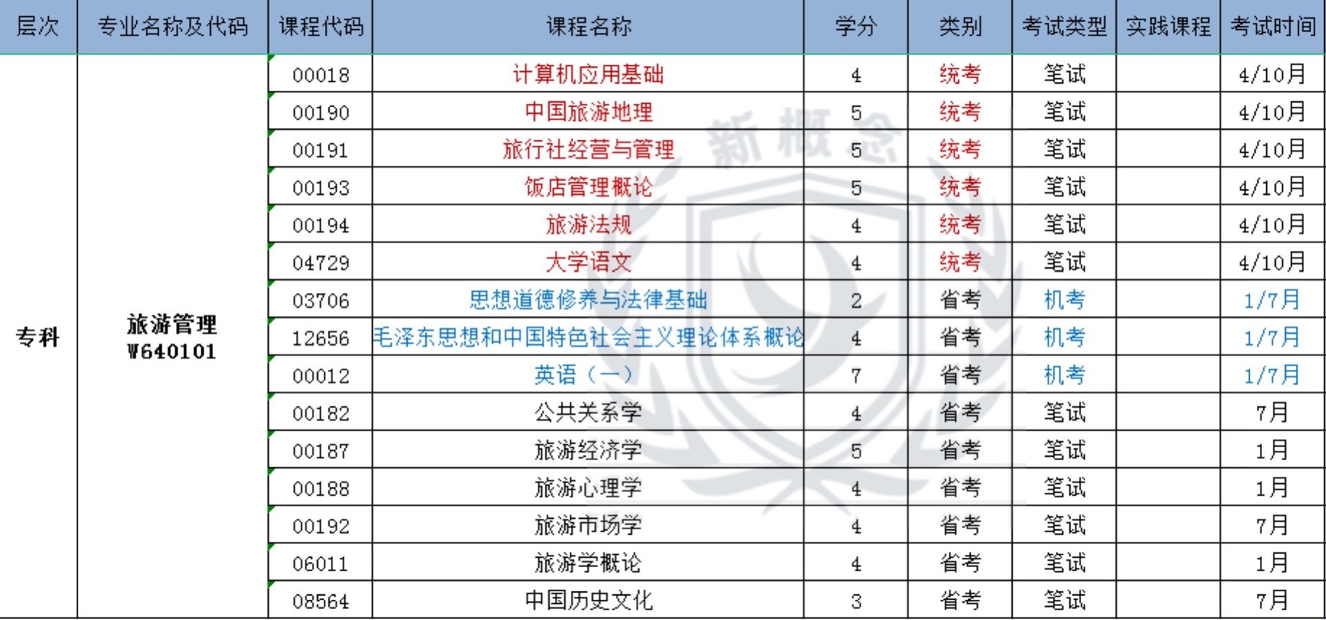 旅游管理——自考专科科目表