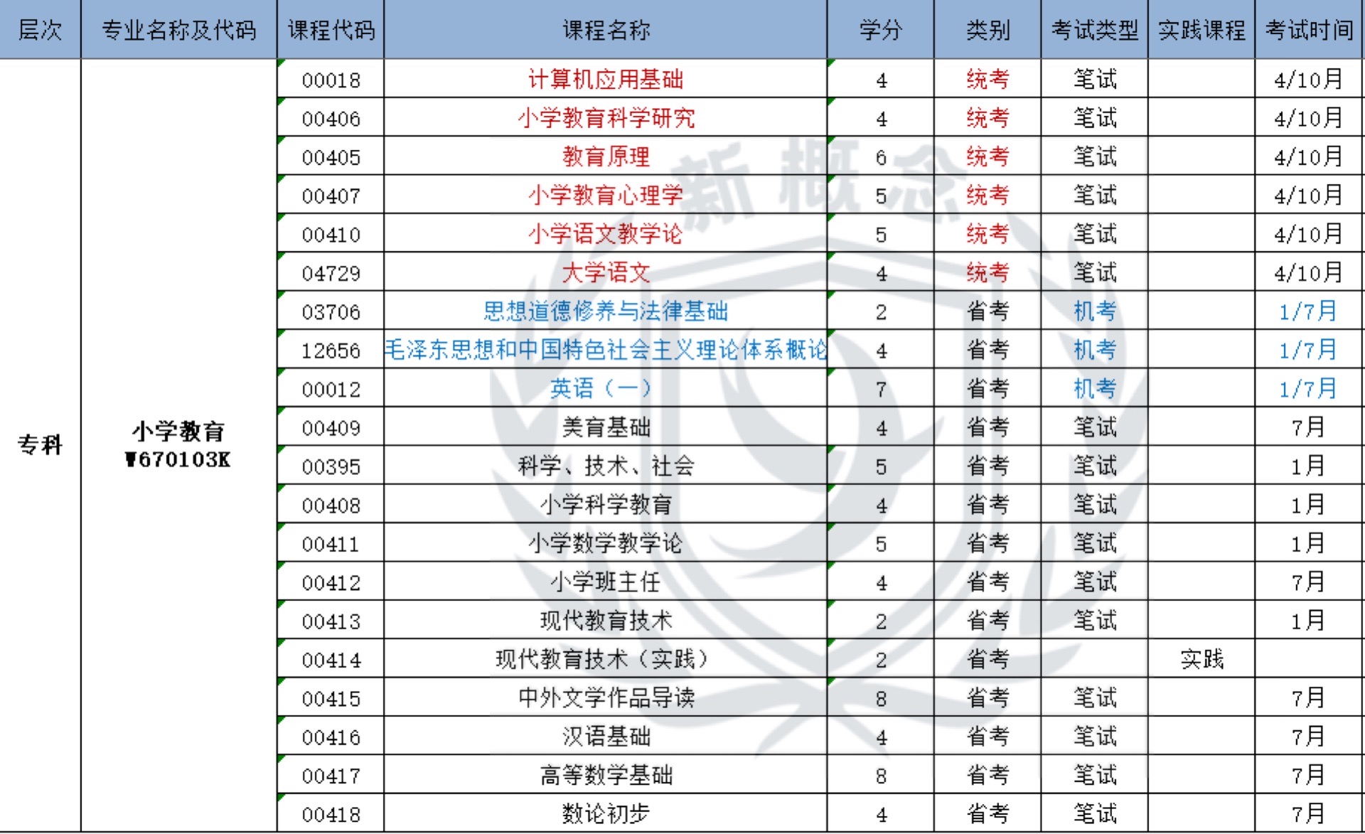 小学教育——自考专科科目表