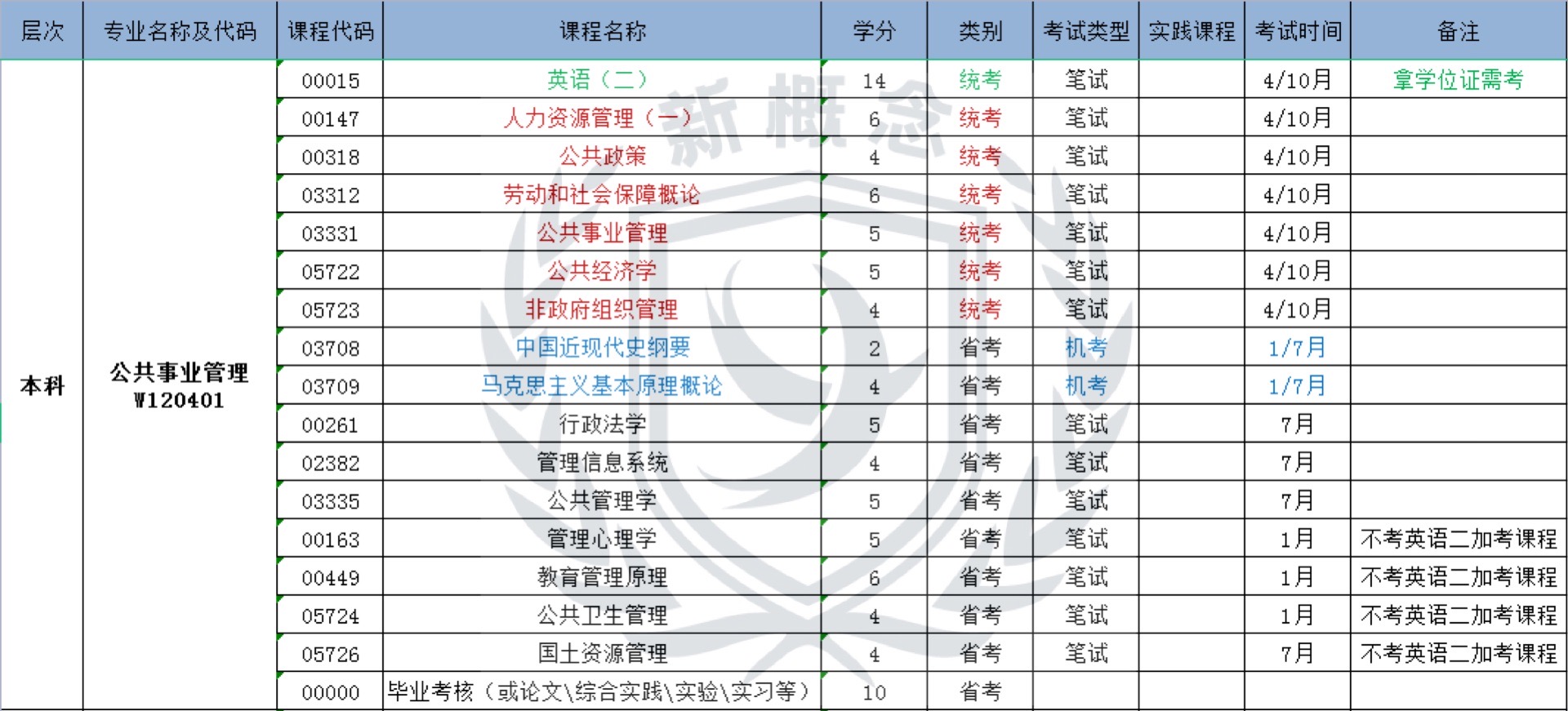 公共事业管理——自考本科科目表
