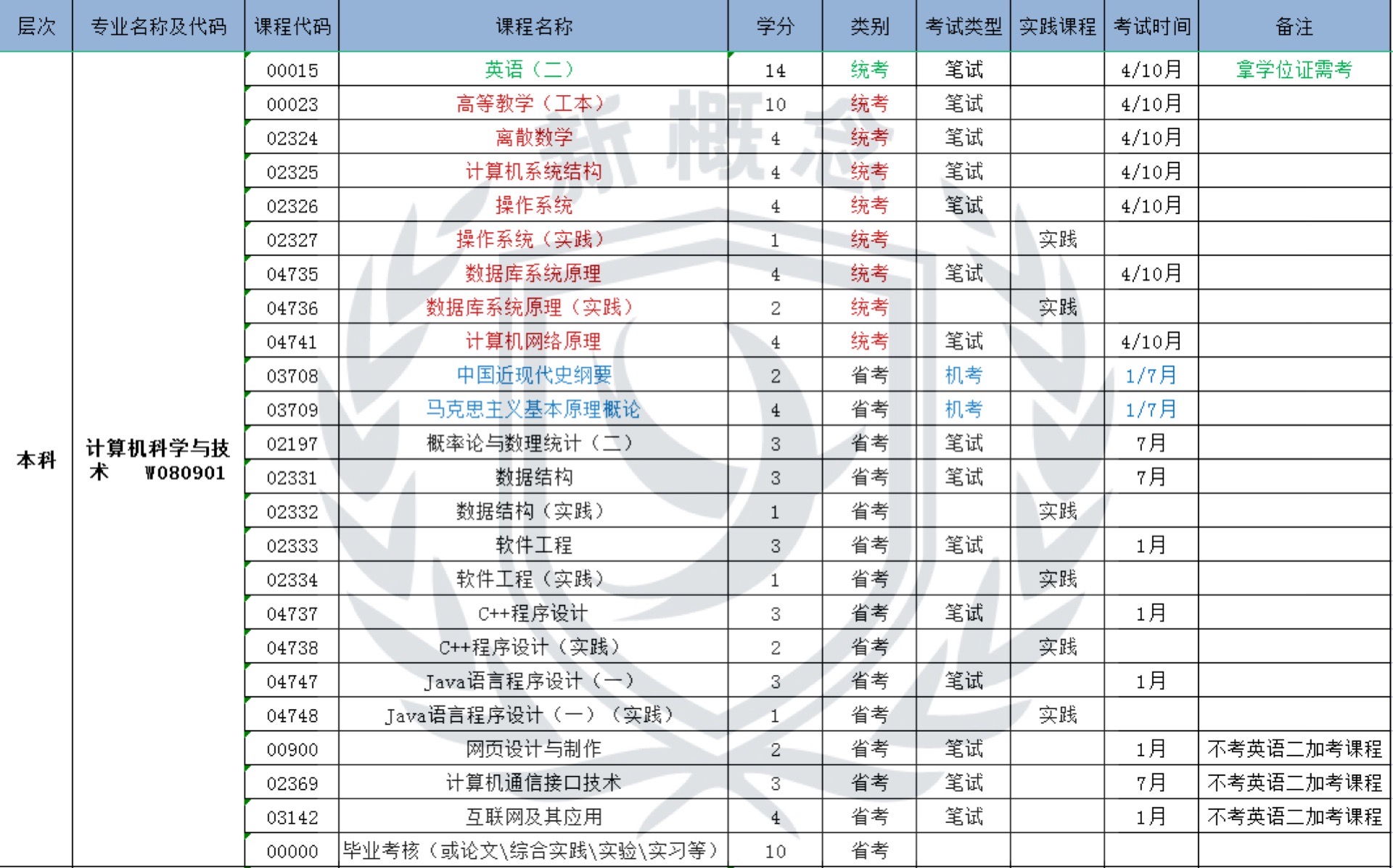 计算机科学与技术——自考本科科目表