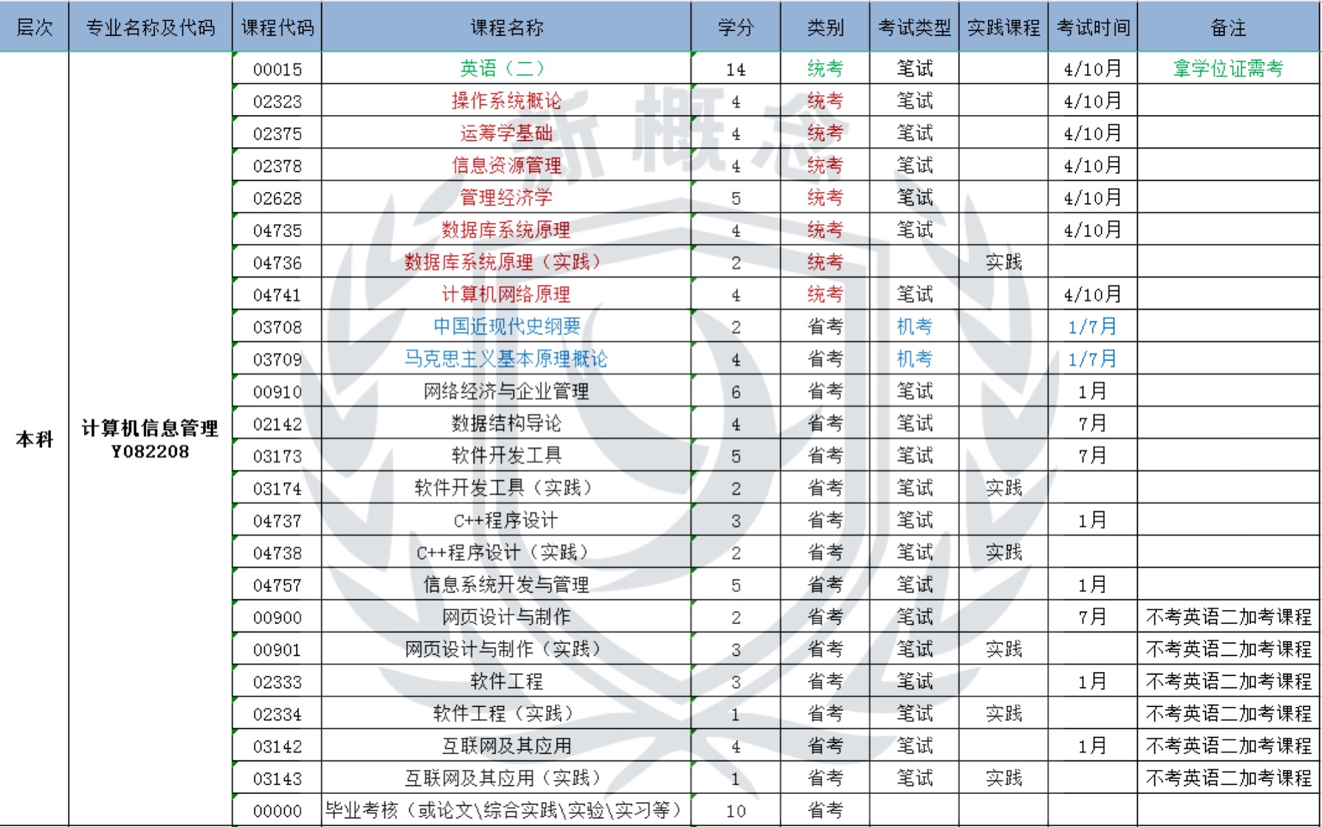 计算机信息管理——自考本科科目表