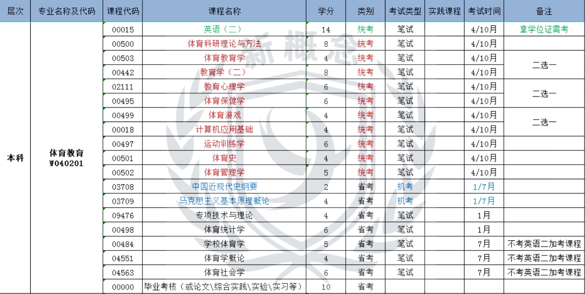 体育教育——自考本科科目表
