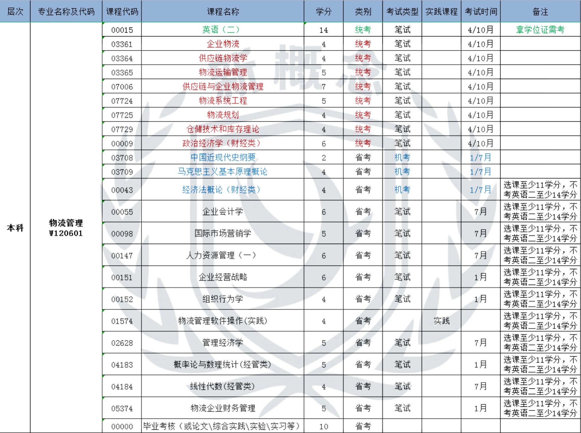 物流管理——自考本科科目表