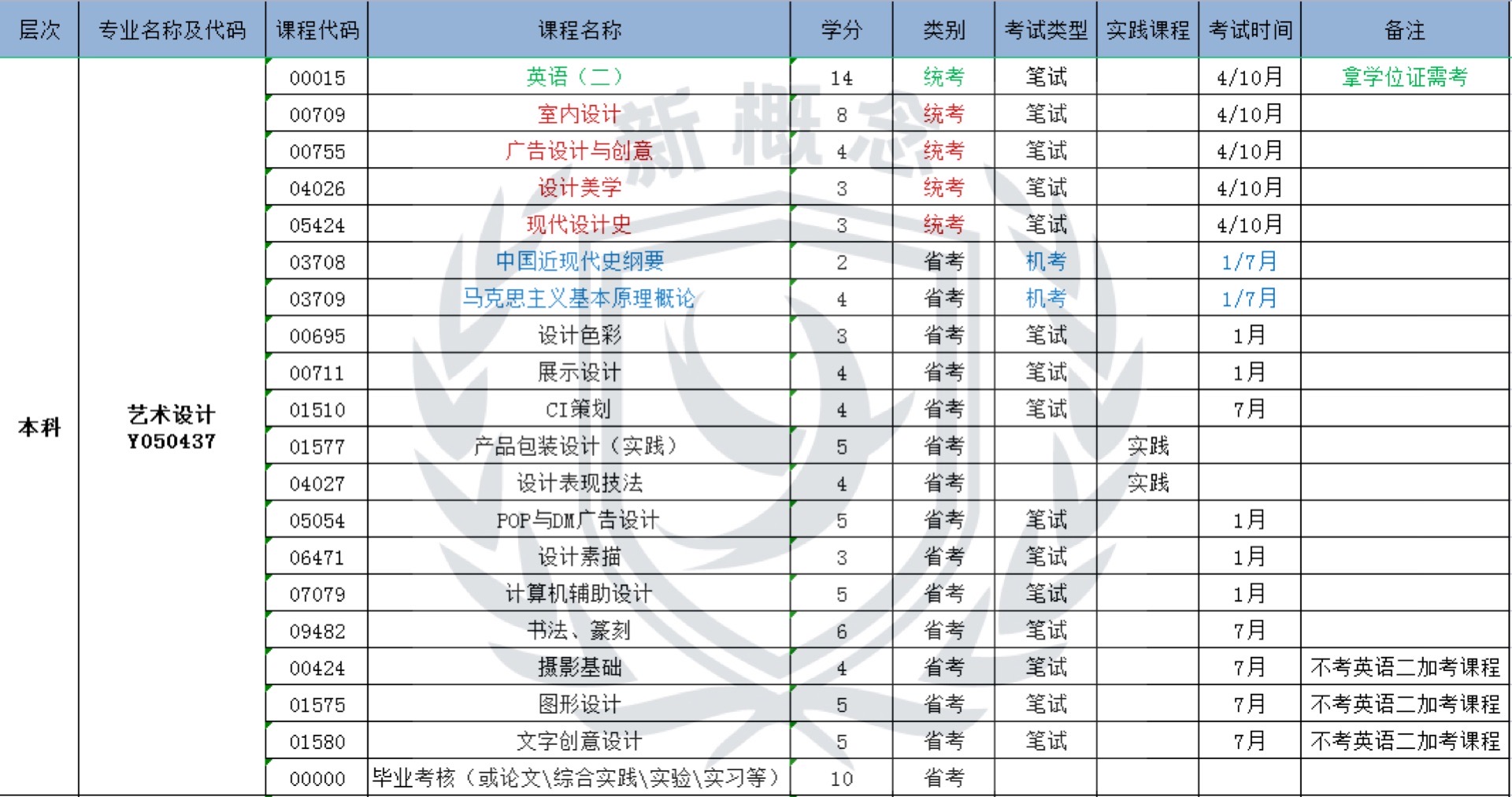 艺术设计——自考本科科目表