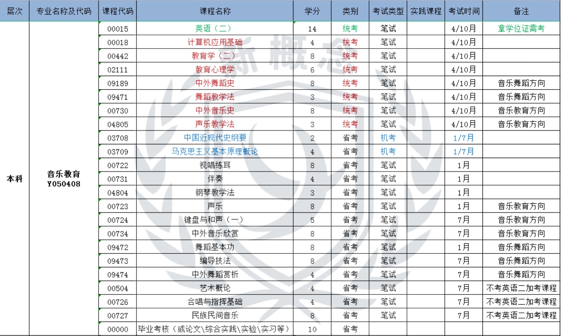 音乐教育——自考本科科目表