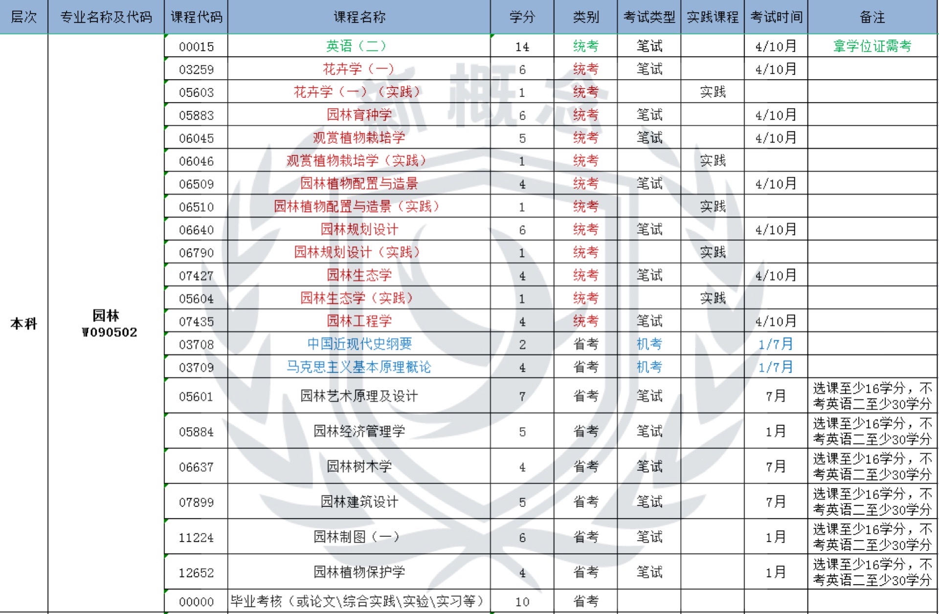 园林——自考本科科目表