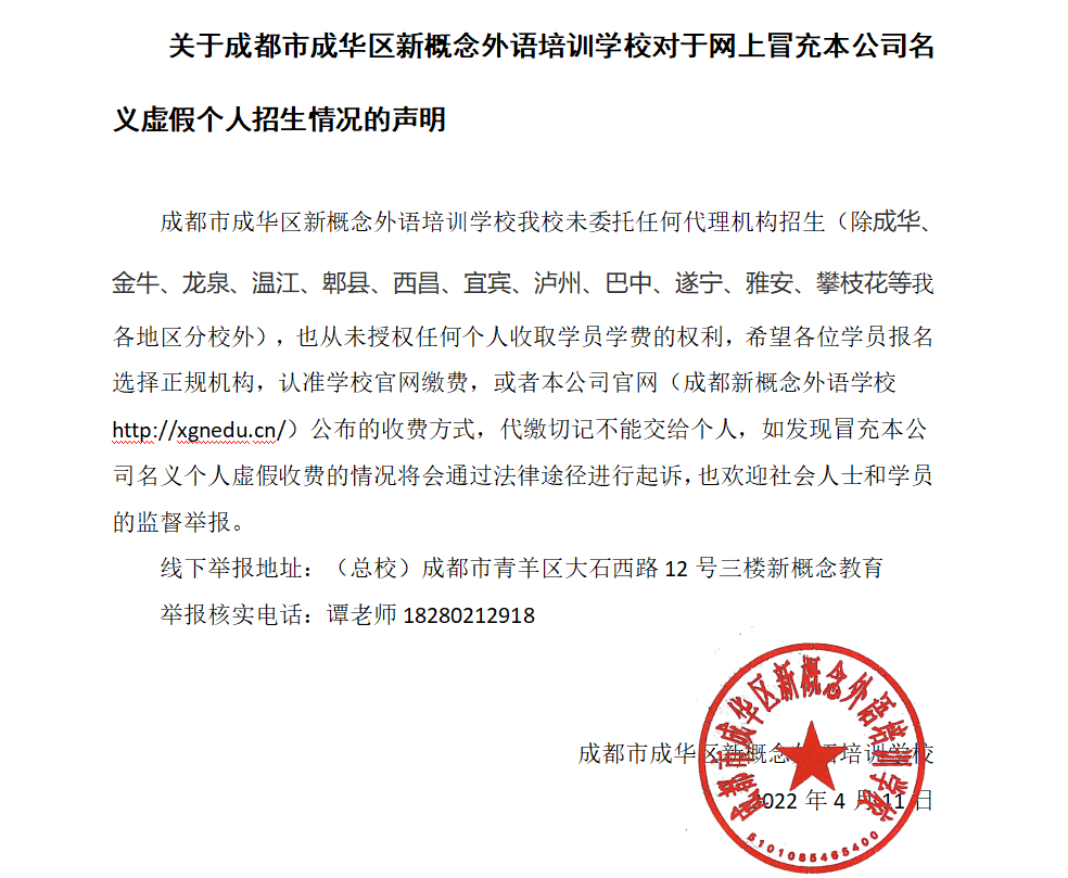 关于成都市成华区新概念外语培训学校对于网上冒充本公司名义虚假个人招生情况的声明
