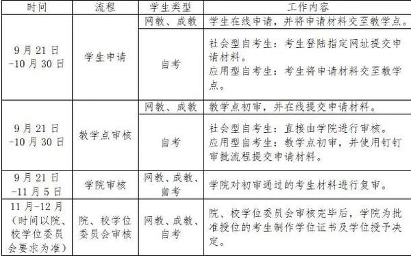 本次成人学士学位申请工作的时间安排及工作内容如下表。