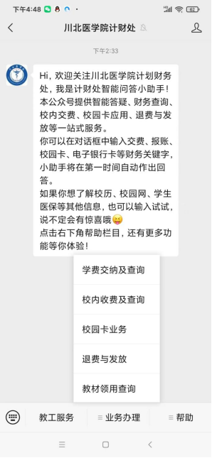 1. 关注川北医学院计财处,点业务办理,选择学费交纳及查询