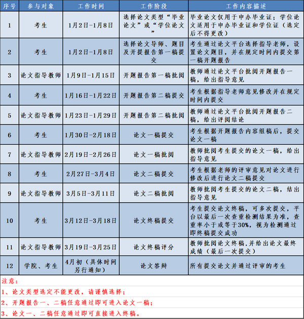 4、考生应在规定时间内登录论文平台,并根据论文写作相关要求,按照时间安排表,完成导师和论文题目选择、开题报告、论文1稿、2稿及终稿提交等工作流程。(如开题报告2稿未通过、论文2稿未通过或论文终稿评分不及格,将无法进入至最终流程,本次论文不通过)。